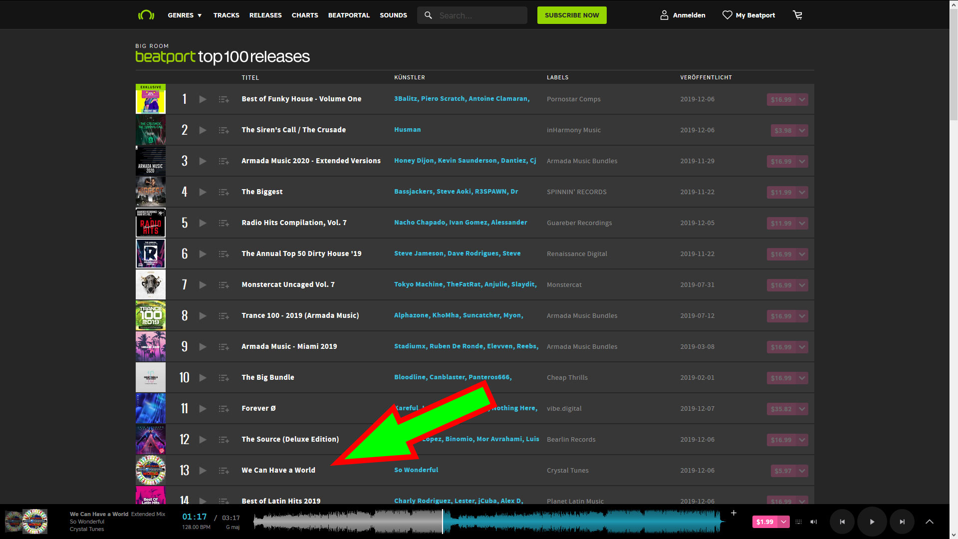 Wow, fast schon ein richtiger Raketenstart! Das neue Release des Electronic Dance Music Projekts "So Wonderful" mit dem Titel "We Can Have a World" platziert sich in den "Big Room >> Beatport Top 100 Releases" Charts und wird aus dem Stand von Rang 0 auf Platz 13 der Charts katapultiert. Zeige Vollbildansicht